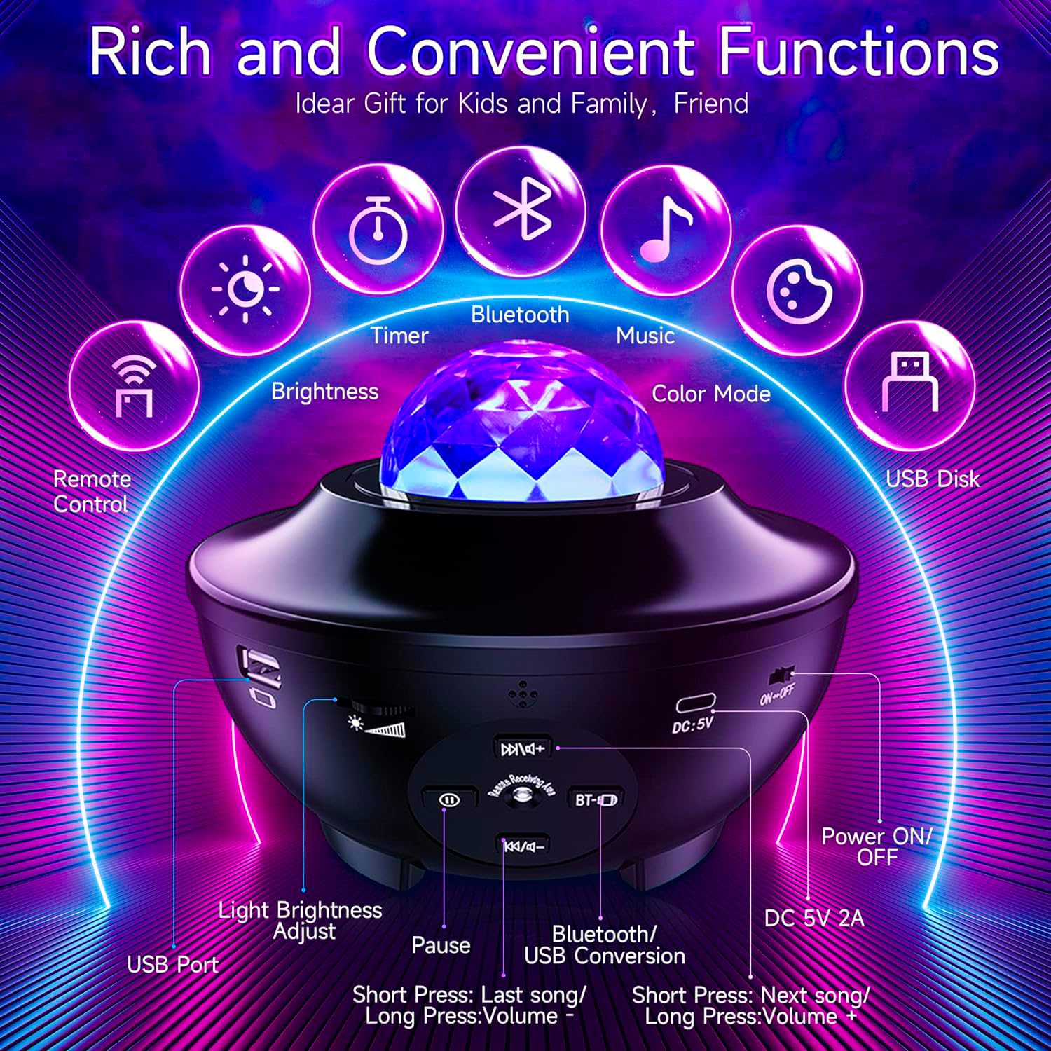 - ✮【REMOTE CONTROL】 You can freely customize the light projection as you want with the remote controller—turning the light on and off, adjusting the brightness, choosing multiple colours, changing the wave light rotation speed, adjusting music volume, switching sound-activated mode, controlling the stars fade in/fade out/static.